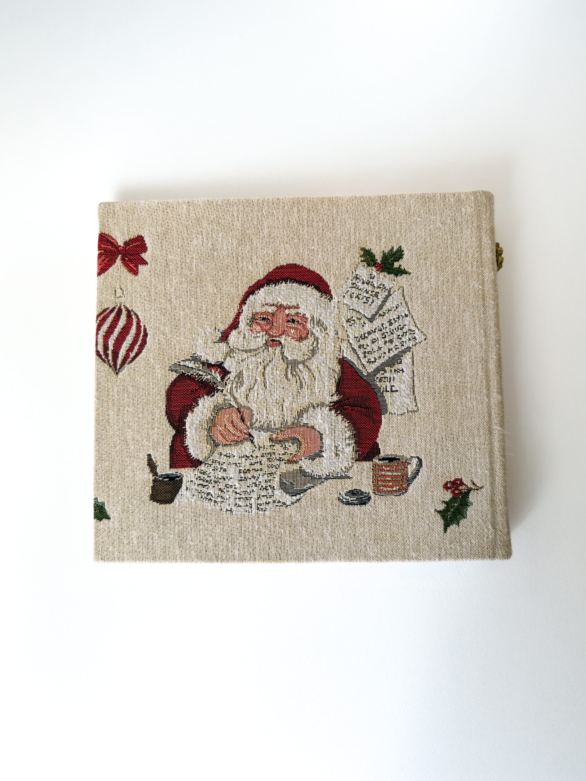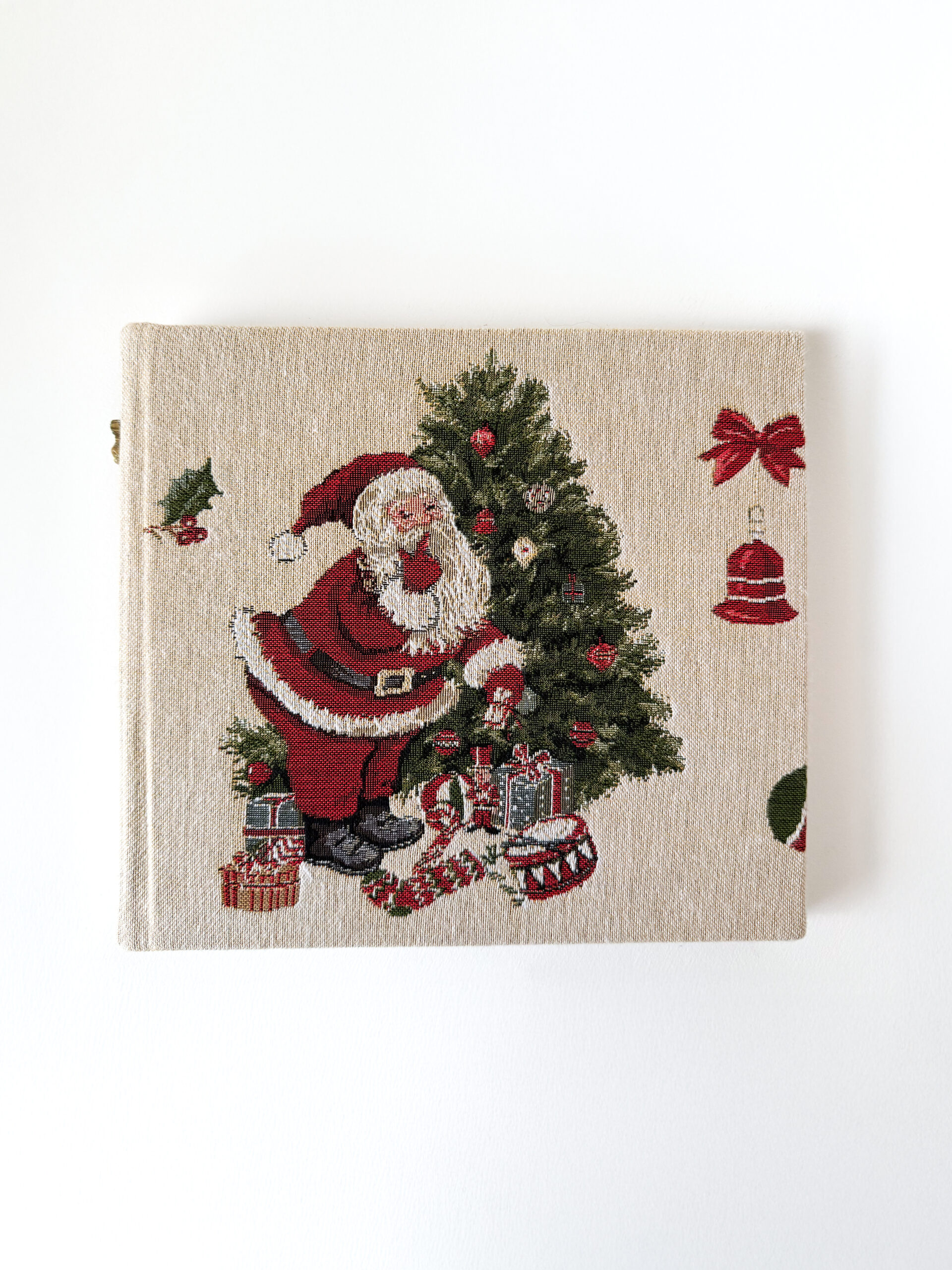 Šis šiltas ir jaukus foto albumas- tarsi mažas Kalėdų stebuklas, talpinantis brangiausius prisiminimus. Jo viršelis papuoštas  klasikiniu Kalėdų  Seneliu, dovanojančiu džiaugsmą ir šventinę nuotaiką. Austo audinio faktūra  suteikia ypatingo žavesio ir elegancijos, o vidiniai lapai dvelkia šventine ramybe- dekoruoti eglės šakelėmis, cukrinėmis lazdelėmis, kameromis ir  puansetijų motyvais