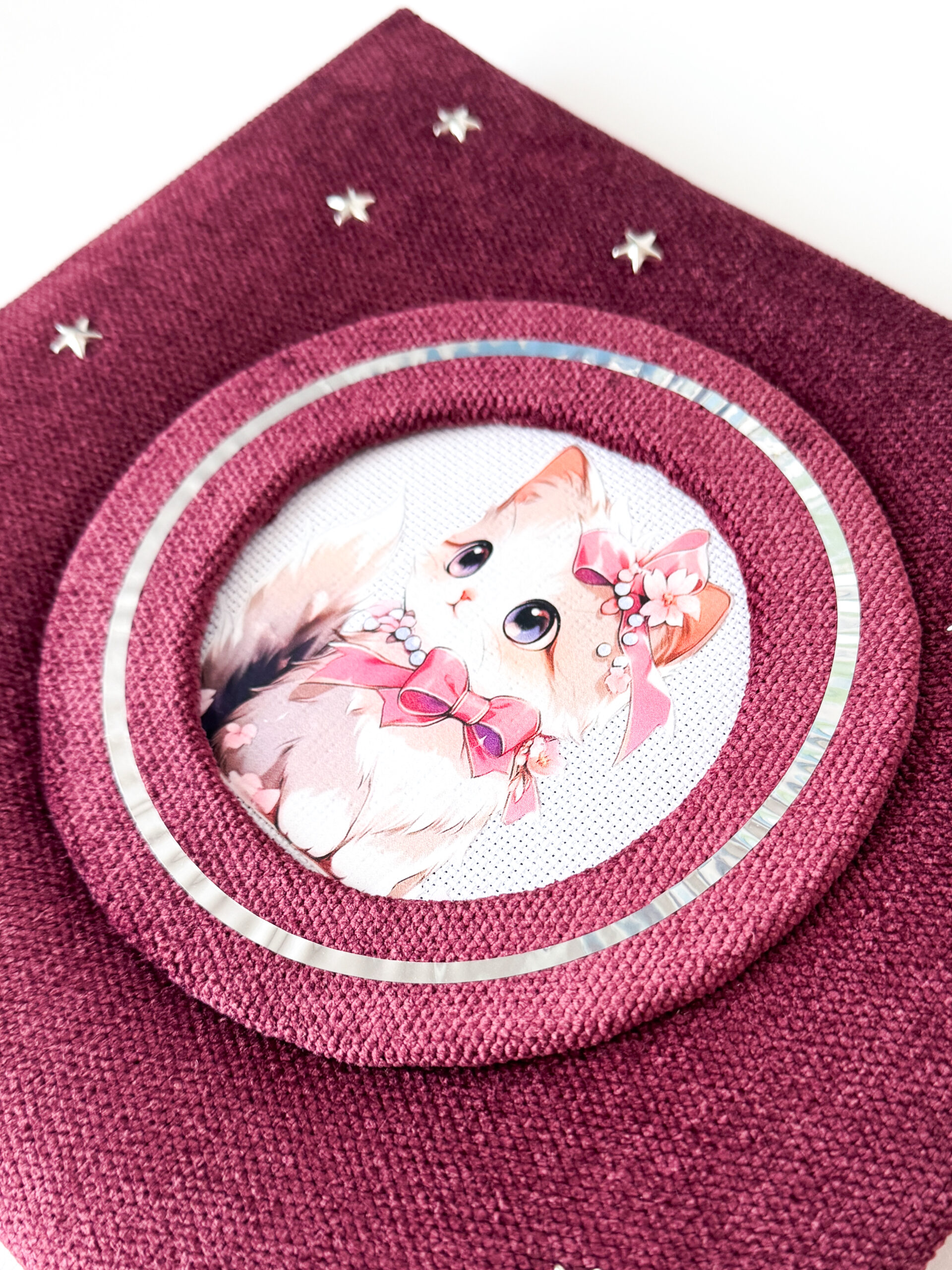 Unikalus, rankų darbo foto albumas su švelniu viršeliu ir žavinga katyte centre. Puoštas sidabriniais žvaigždučių akcentais, šis albumas spinduliuoja šilumą ir jaukumą.