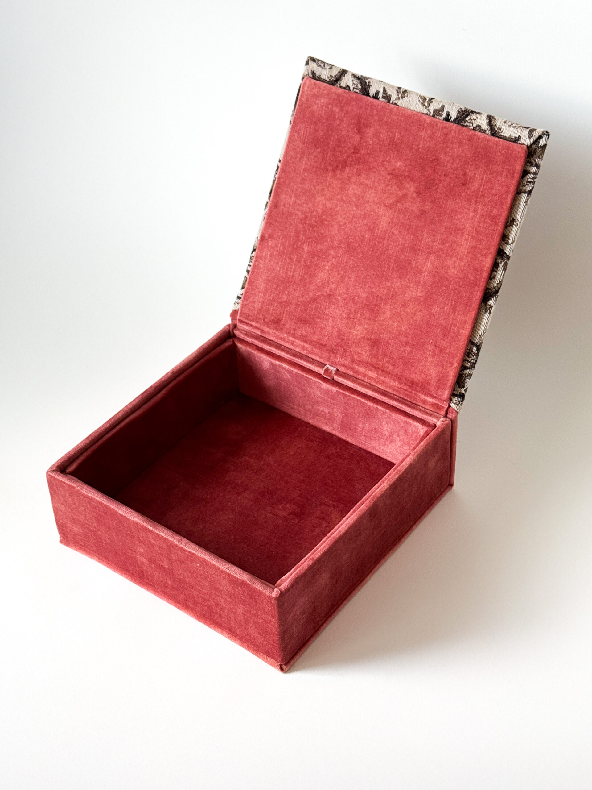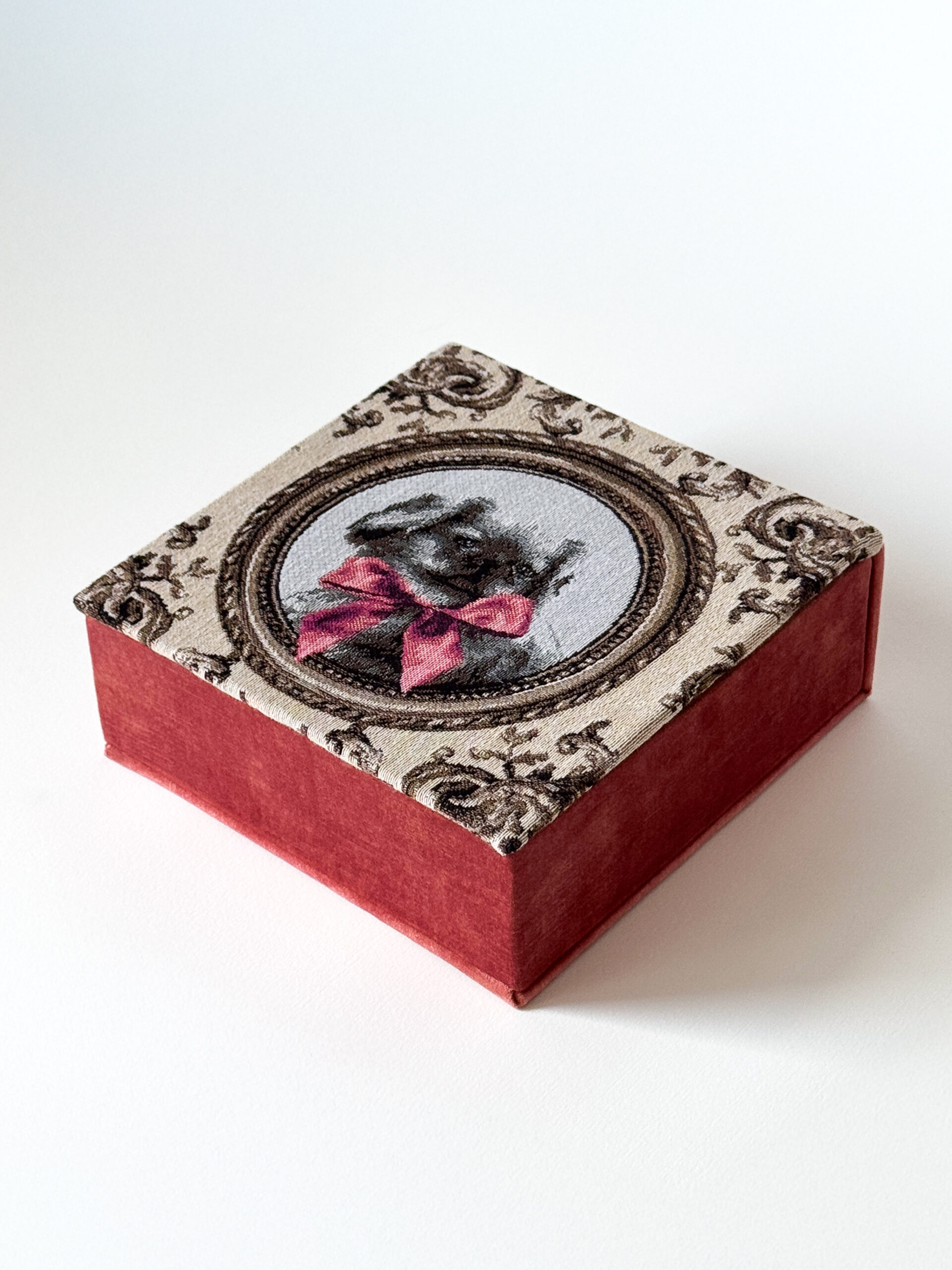 Ši rankų darbo dėžutė- tarsi mažas prisiminimų lobynas. Švelnus lašišos spalvos aksomas šildo akį, o dangtelį puošia žavingas šuniukas rožinio kaspino fone- tarsi ištikimas sargas, saugantis tavo brangiausias smulkmenas. Kiekviena detalė- apgalvota ir kruopščiai atlikta, todėl ši dėžutė ne tik praktiška, bet ir jauki interjero puošmena. Tobula dovana tiems, kurie mėgsta originalius, švelniai nostalgiškus daiktus su siela.