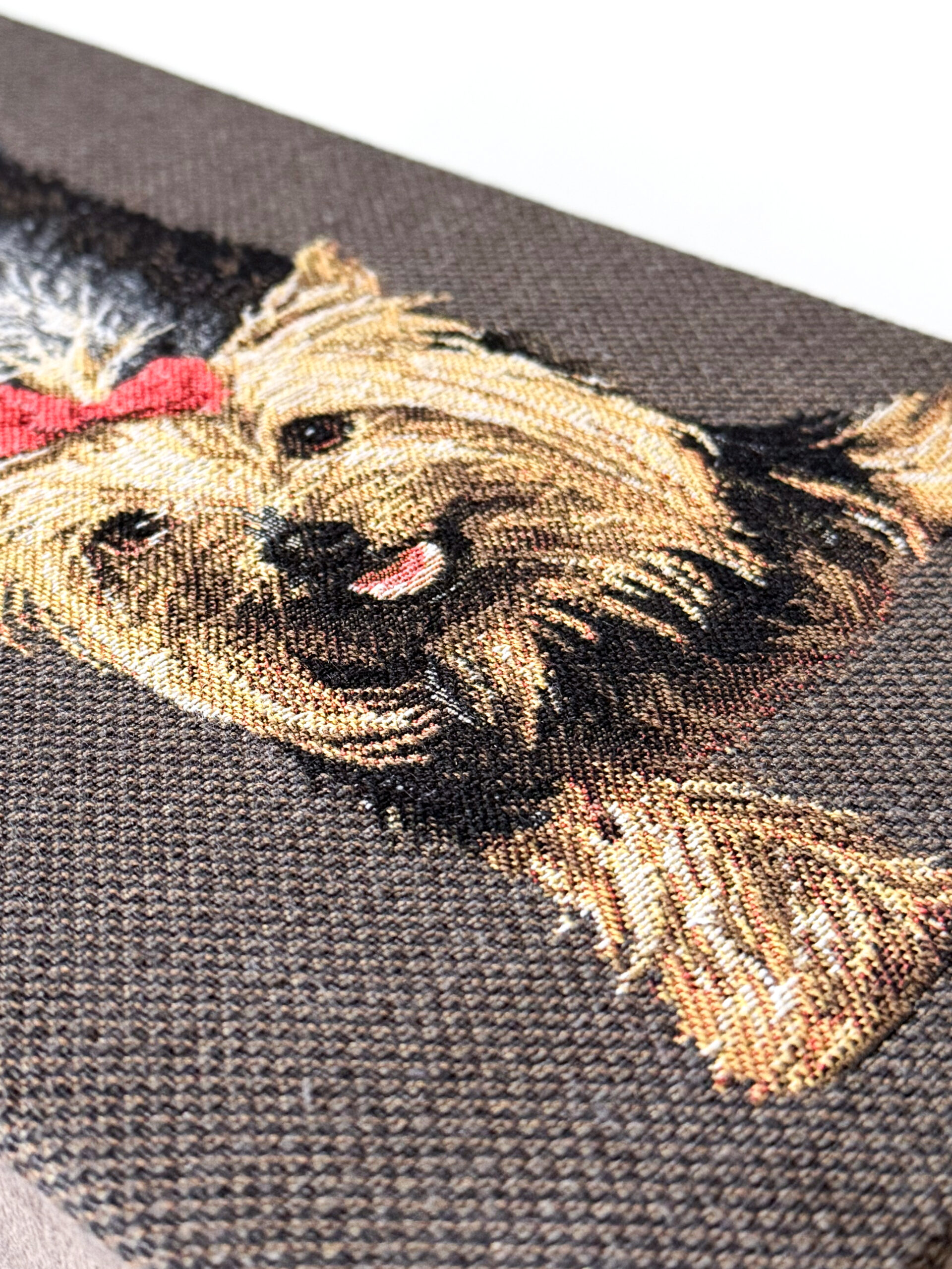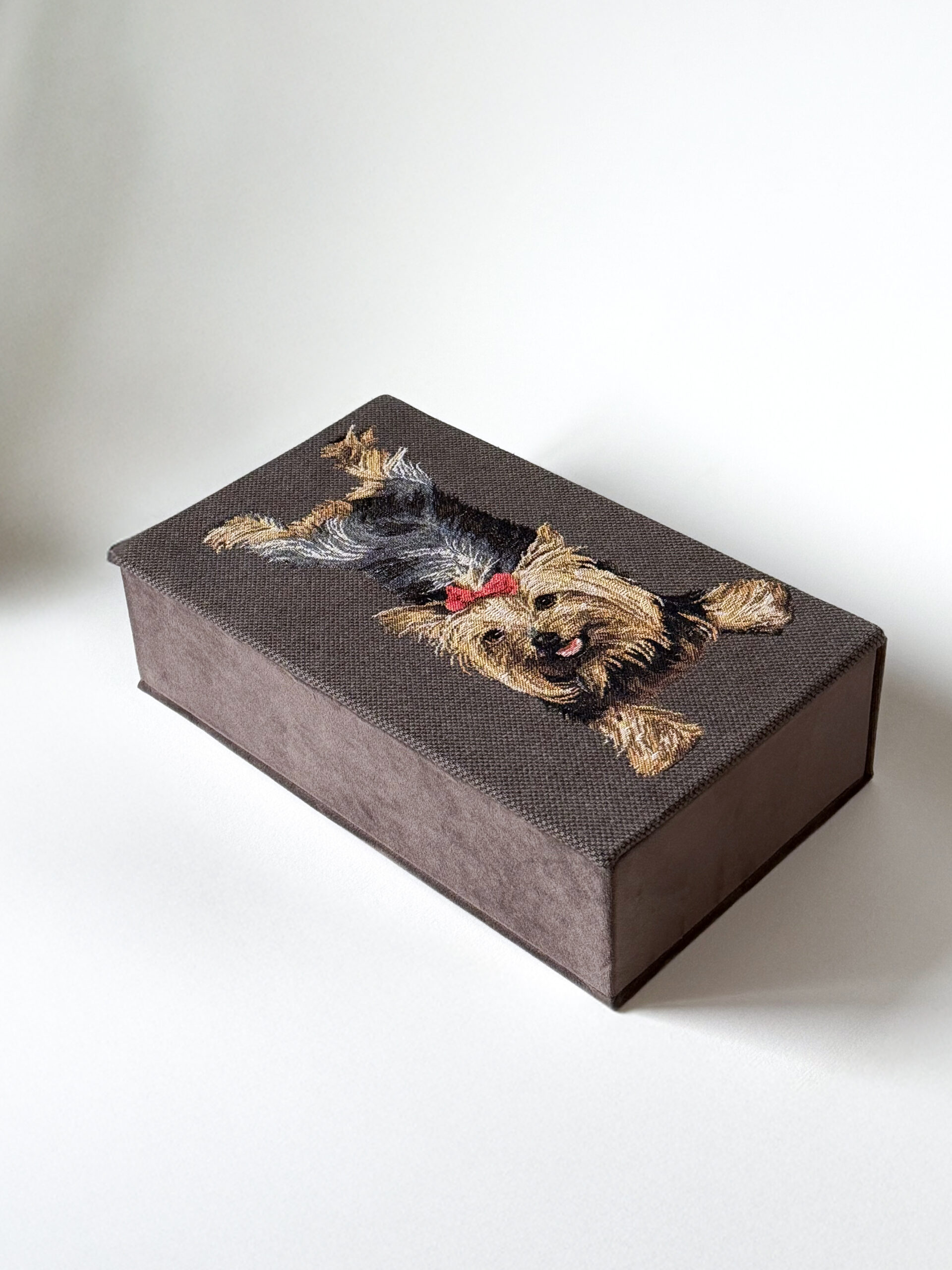 Išskirtinio dizaino rankų darbo dėžutė, puošta siuvinėtu šuniuko atvaizdu. Tai ne tik praktiška daiktų laikymo priemonė, bet ir žavinga interjero detalė, suteikianti namams jaukumo.