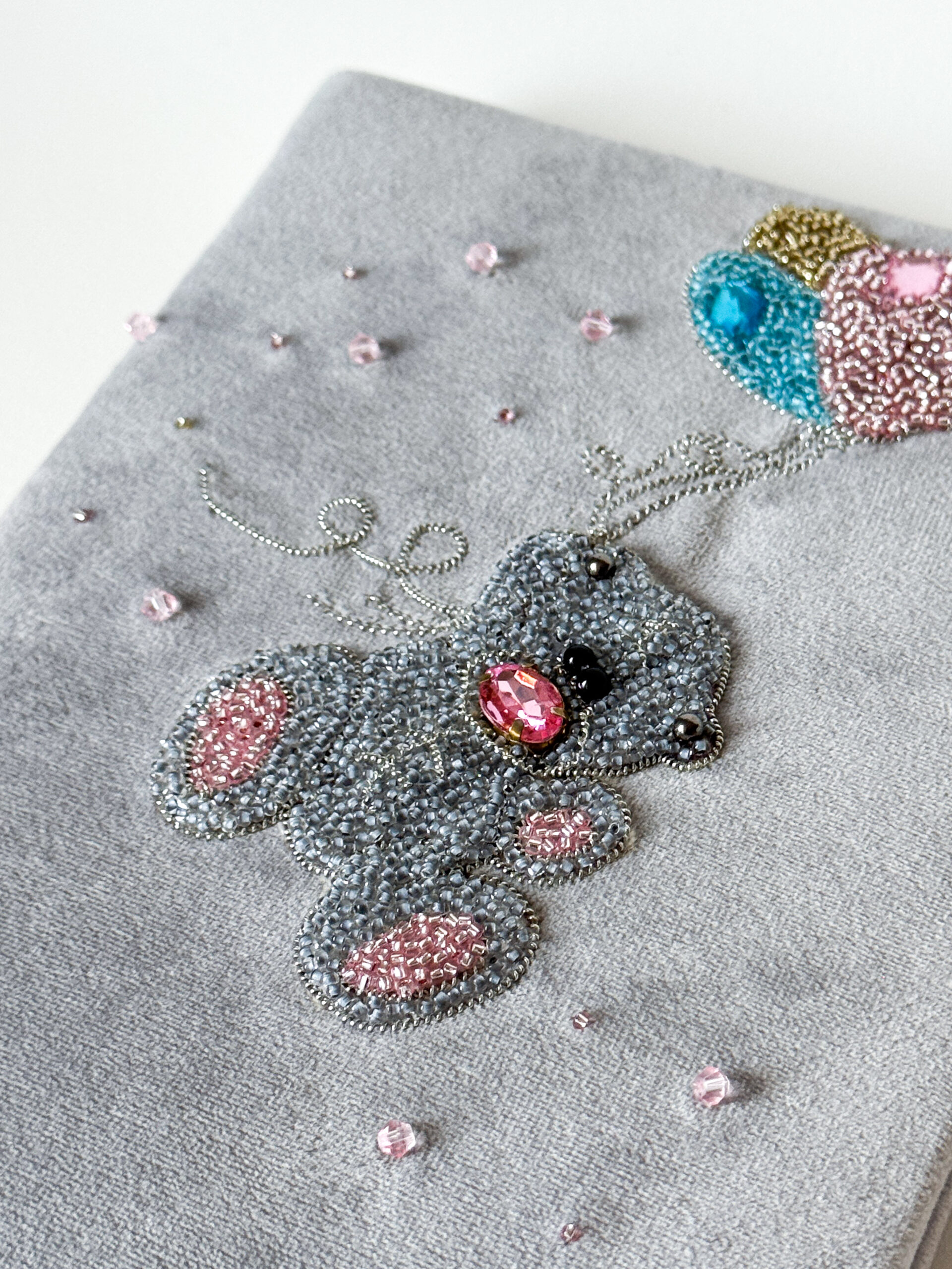 Išskirtinė, rankomis siuvinėta užrašinė, kurios viršelį puošia karoliukais išsiuvinėtas pilkas meškutis su spalvotais balionais. Pilkos spalvos aksominis pagrindas suteikia elegancijos, o kruopščiai siuvinėtos detalės – žaismingumo ir unikalumo. Kiekviena detalė spindi subtiliu žavesiu, tarsi mažytė pasaka. Tai tikras rankų darbo grožis, kuris tiktų tiek dovanai, tiek asmeniniam naudojimui.